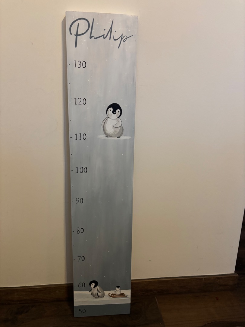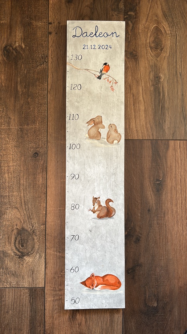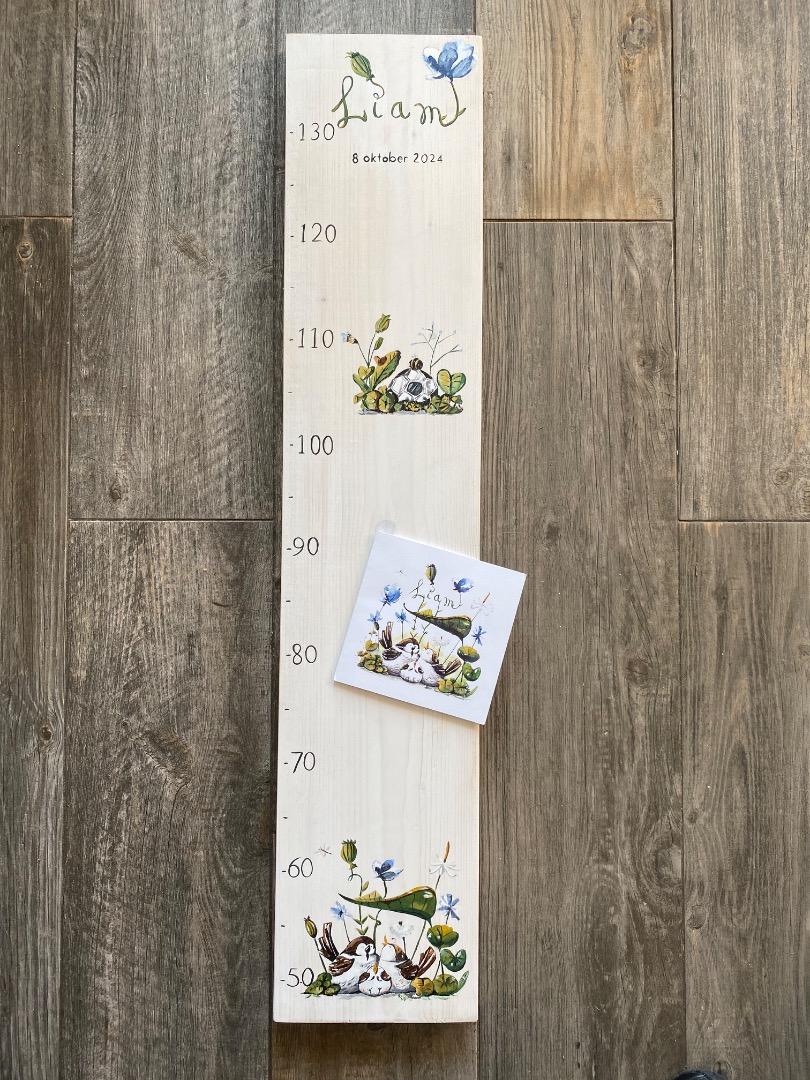 Neem contact op om door te spreken wat wensen zijn. Stuur een duidelijke foto van zowel de binnen als de buitenkant van het geboortekaartje, het liefst bij daglicht en ik schilder dan de groeimeter met de hand en naar wens. Wilt u gegevens zoals een geboortedatum, lengte, gewicht op de groeimeter terug zien, laat dit dan weten, dan verwerk ik het er in.