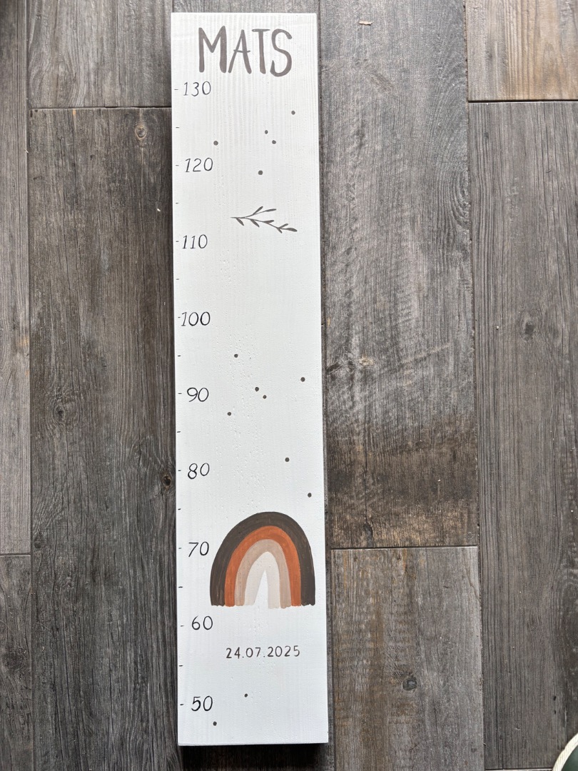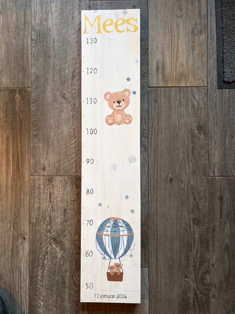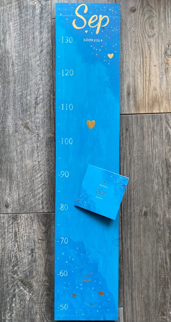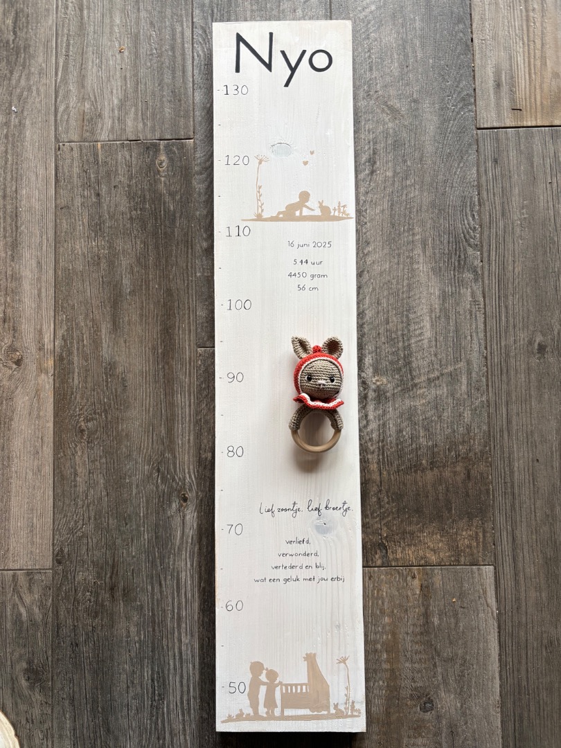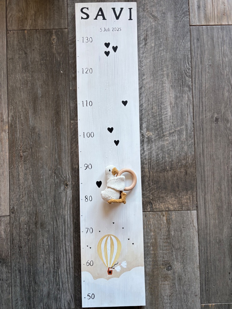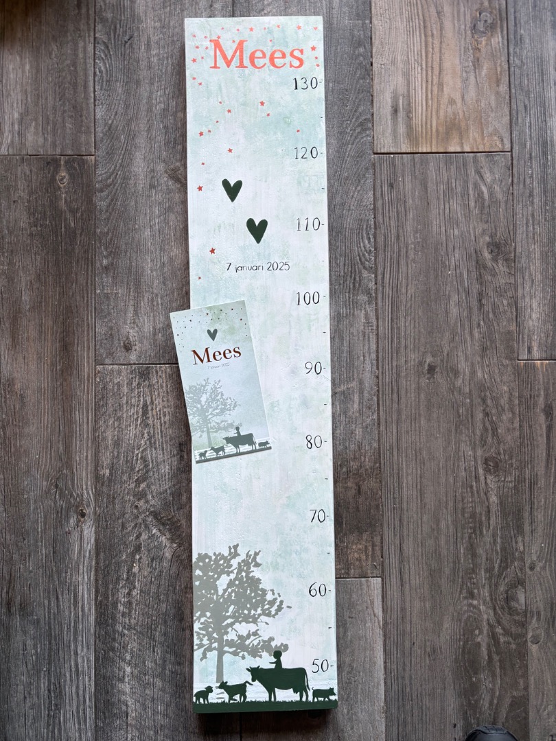 In plaats van het geboortekaartje is het ook mogelijk om een groeimeter op maat te bestellen, dus in de kleuren van de babykamer, met een bepaald thema of wat je maar wenst. Veel is mogelijk.