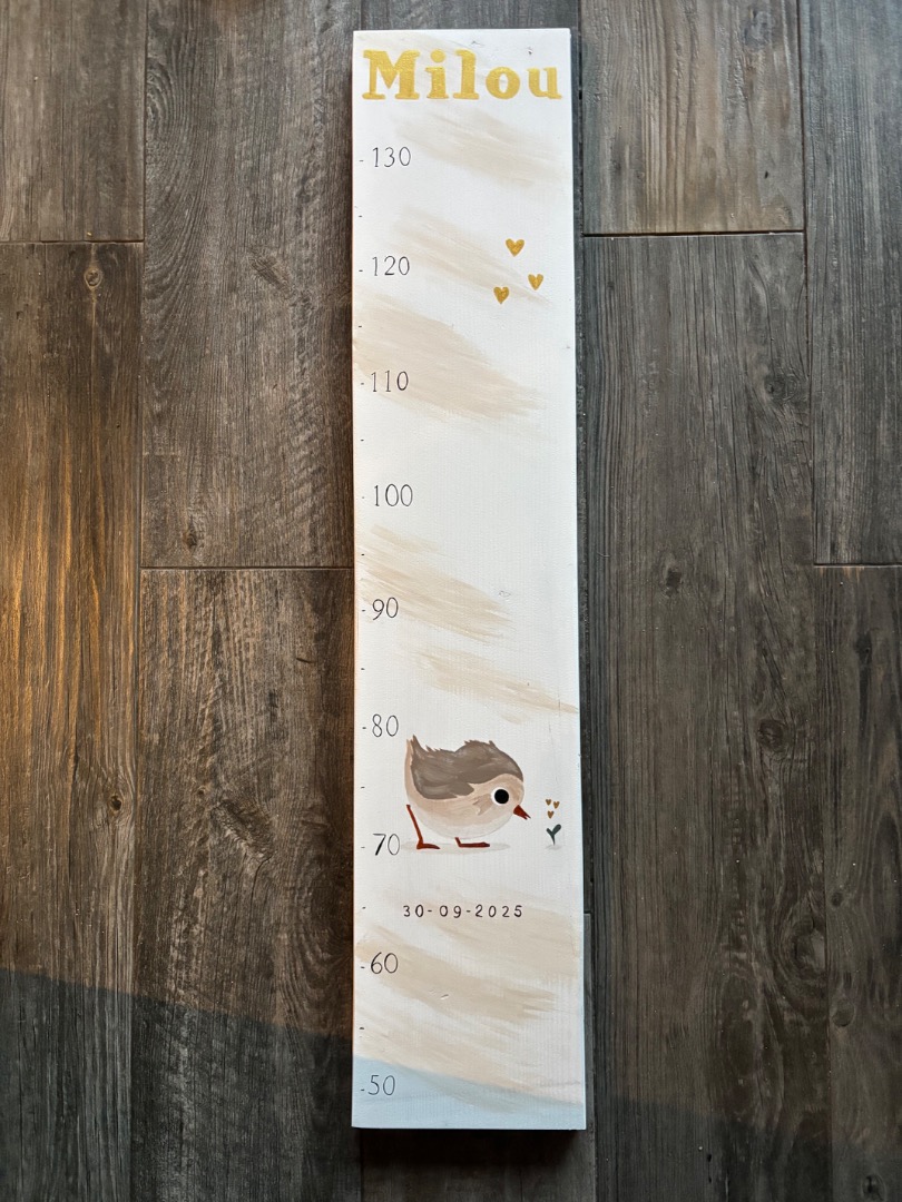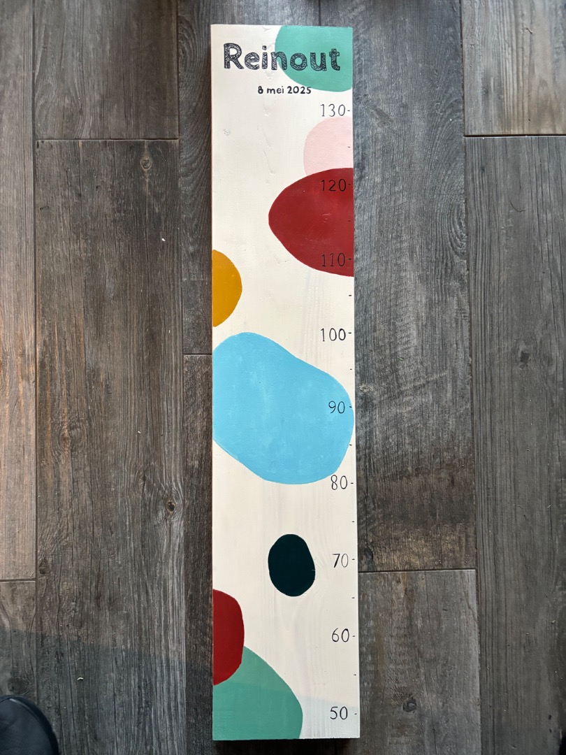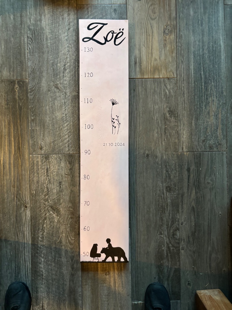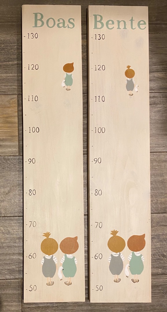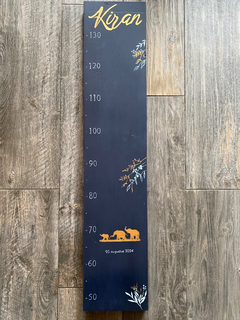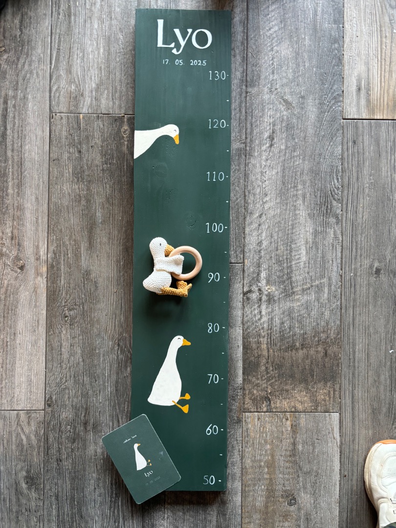 In plaats van het geboortekaartje is het ook mogelijk om een groeimeter op maat te bestellen, dus in de kleuren van de babykamer, met een bepaald thema of wat je maar wenst. Veel is mogelijk.
