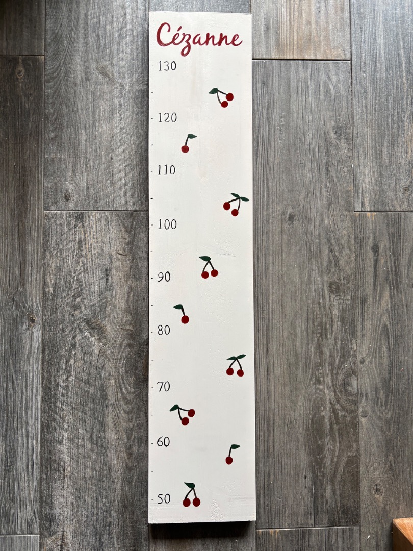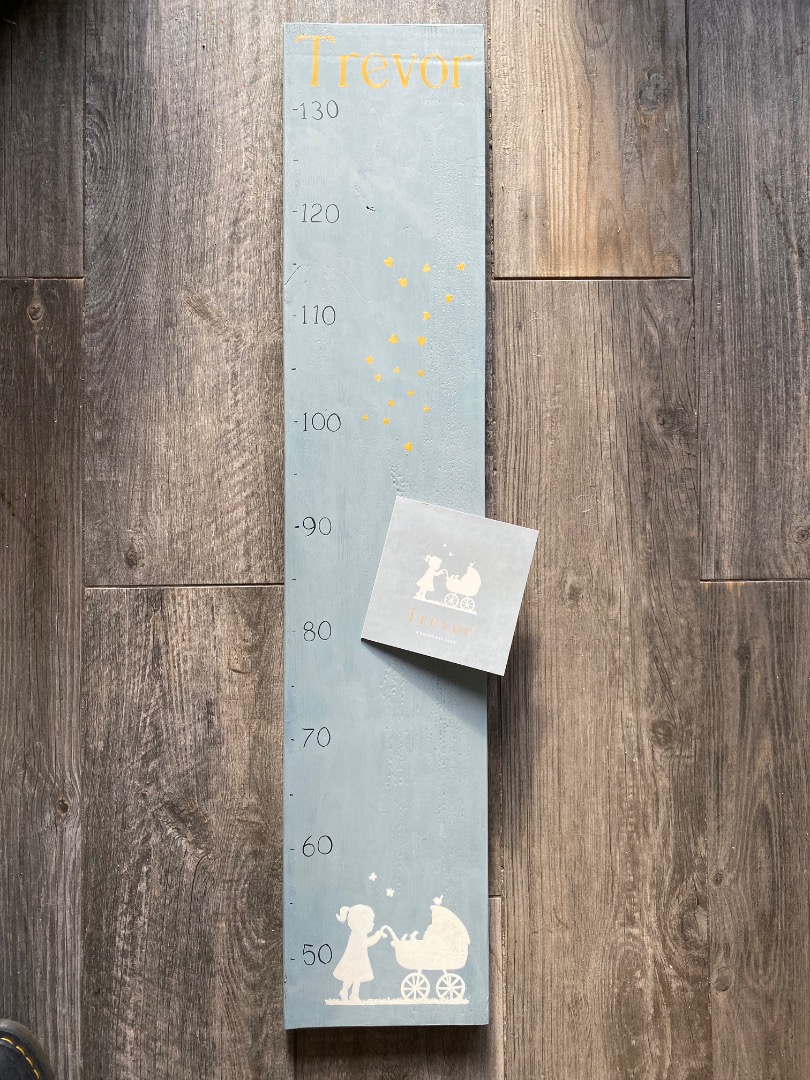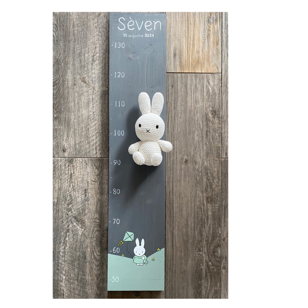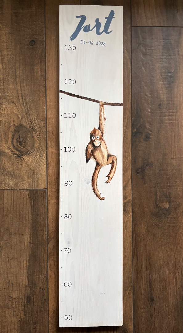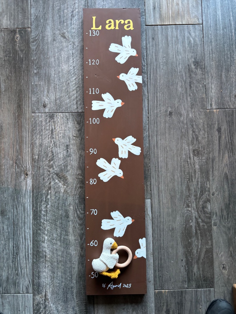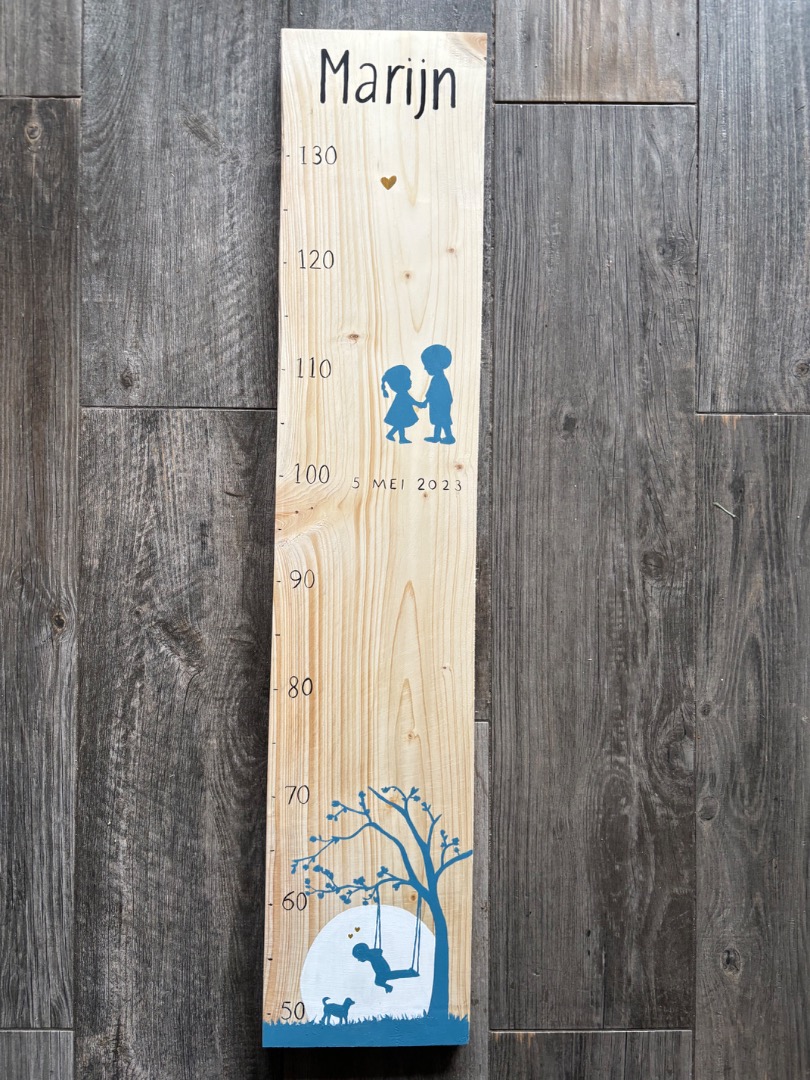 In plaats van het geboortekaartje is het ook mogelijk om een groeimeter op maat te bestellen, dus in de kleuren van de babykamer, met een bepaald thema of wat je maar wenst. Veel is mogelijk.