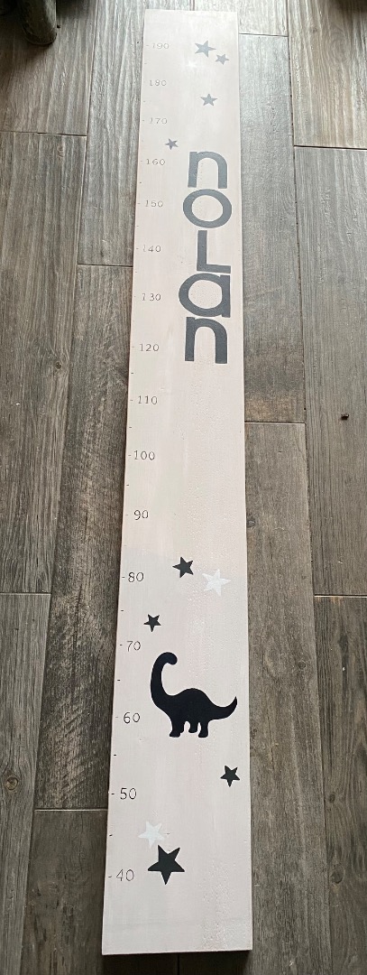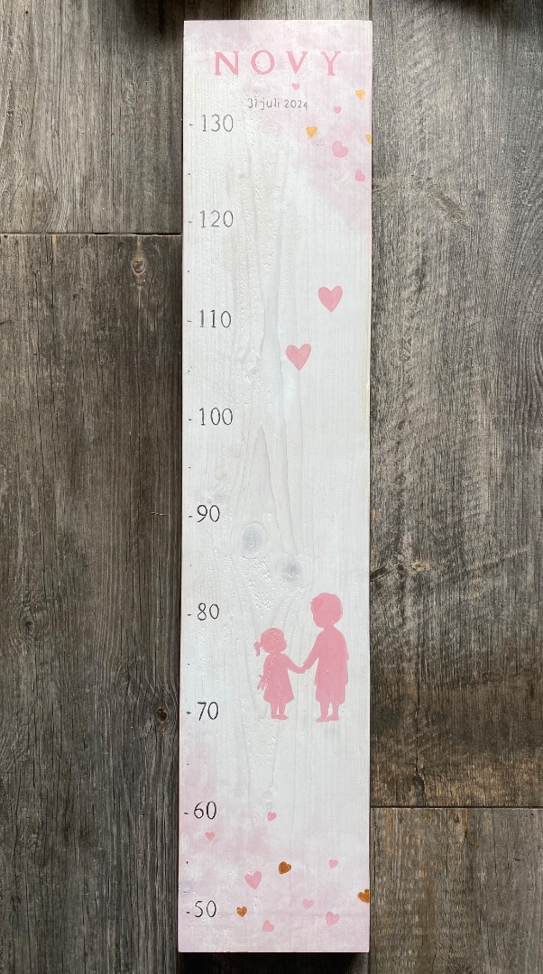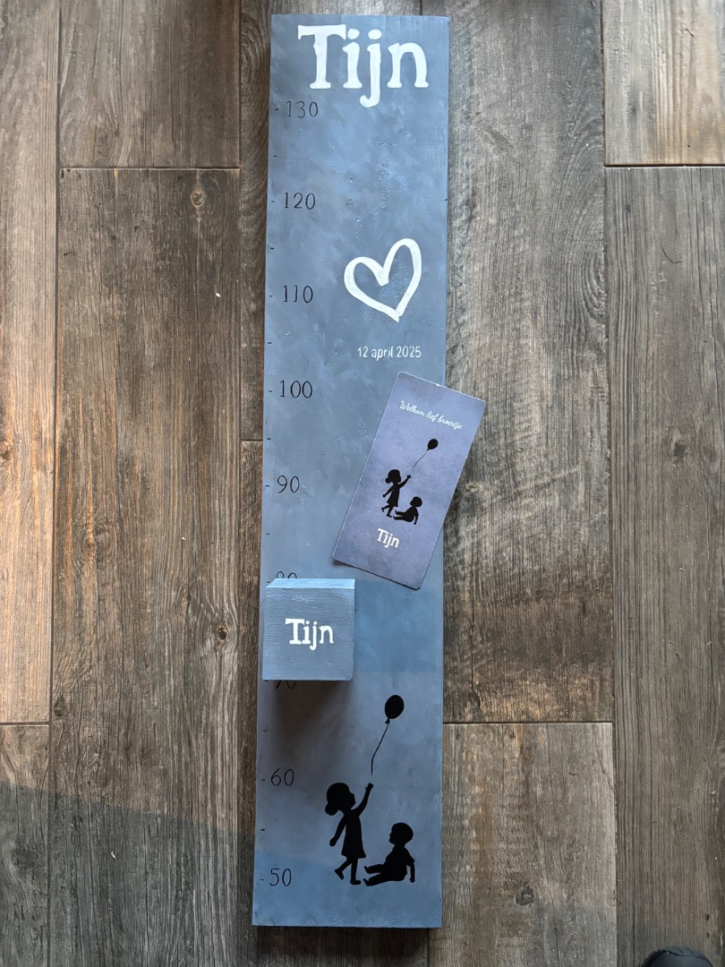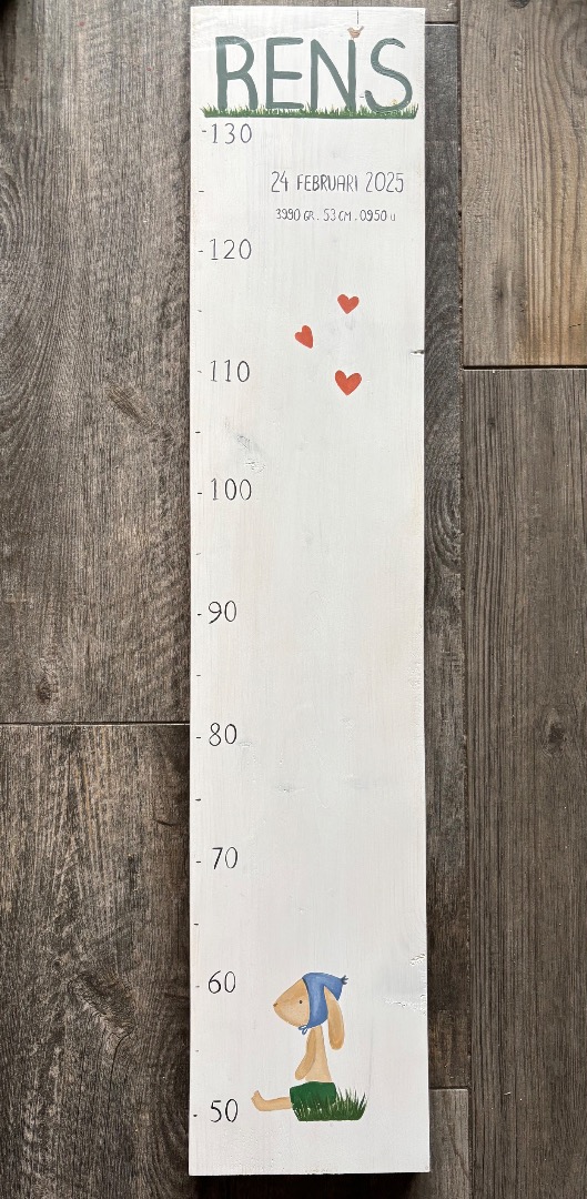 Handgeschilderde groeimeter van steigerhout met het geboortekaartje als inspiratie. Een persoonlijk en orgineel cadeau. Ik schilder met de hand een groeimeter aan de hand van het geboortekaartje. Het valt altijd in de smaak omdat het geboortekaartje door de ouders zelf is uitgekozen.