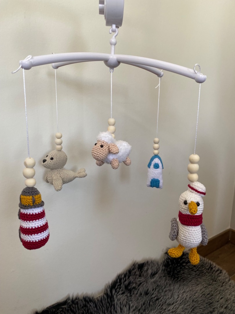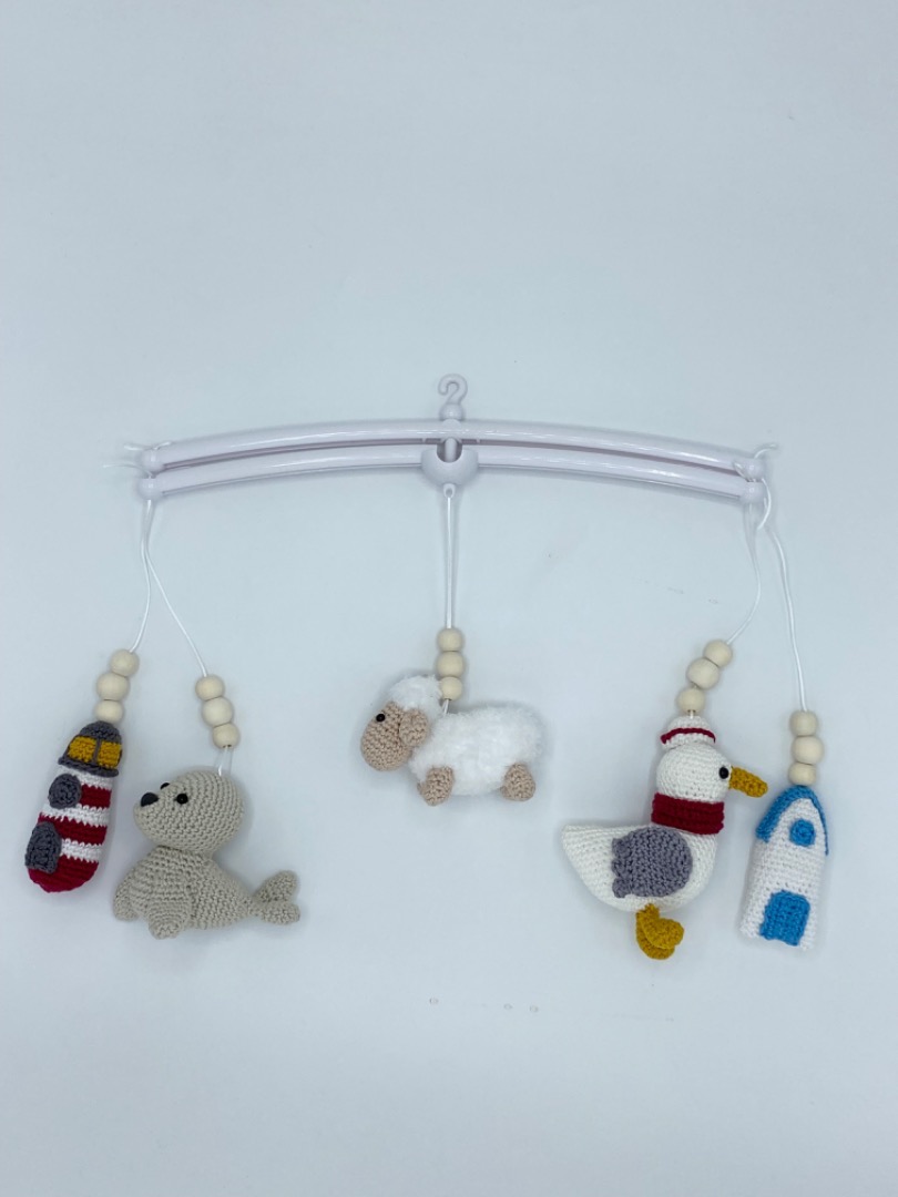 Aan de mobiel hangt een schaap, meeuw, strandhuisje, vuurtoren en zeehond.
